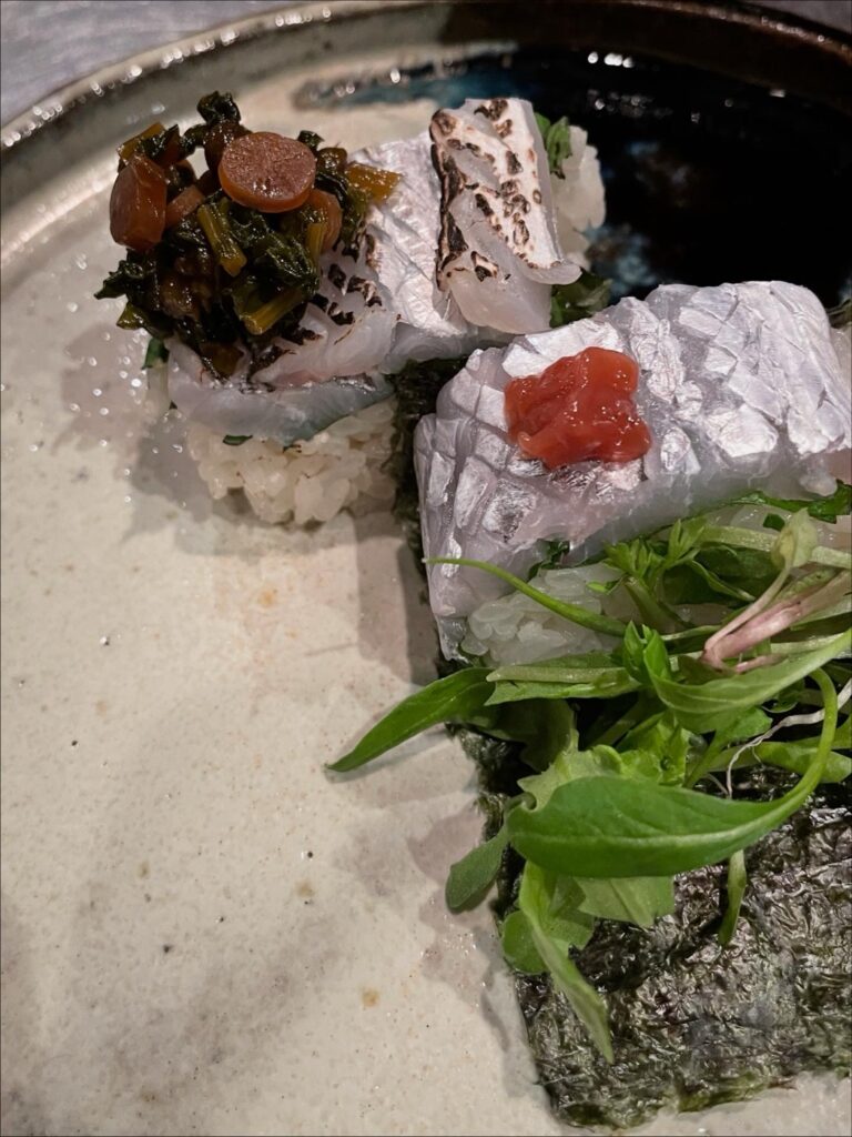 海苔で巻いた磯の香りがまた噛む毎に味の変化を楽しませてくれます